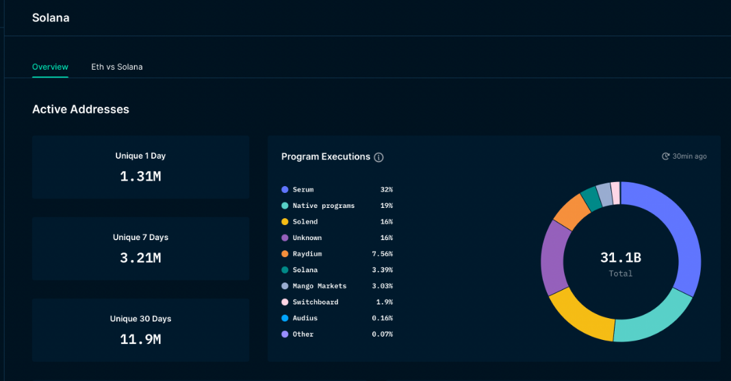 ويوم الخميس، أظهرت صفحة نظرة عامة على Solana من Nansen أن blockchain السريع والرخيص كان لديه 1.31 مليون “زائر فريد ليوم واحد”. استحوذ مصل التبادل اللامركزي (DEX) على 32٪ من “عمليات تنفيذ البرنامج”.